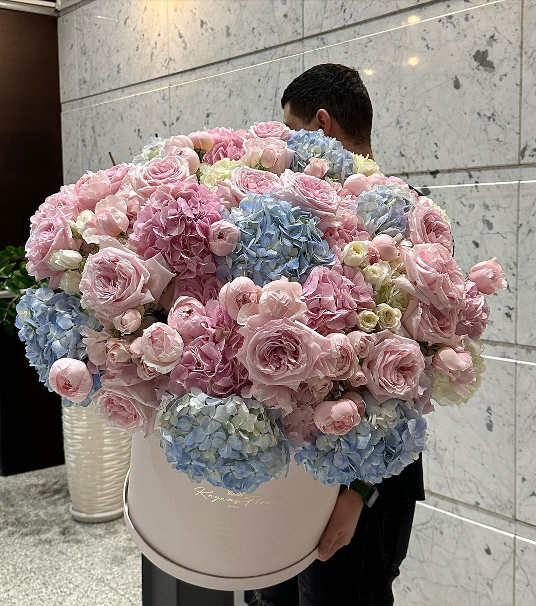 An oversized pastel bouquet with a cloud-like structure, blending soft pink, creamy ivory, and airy...
