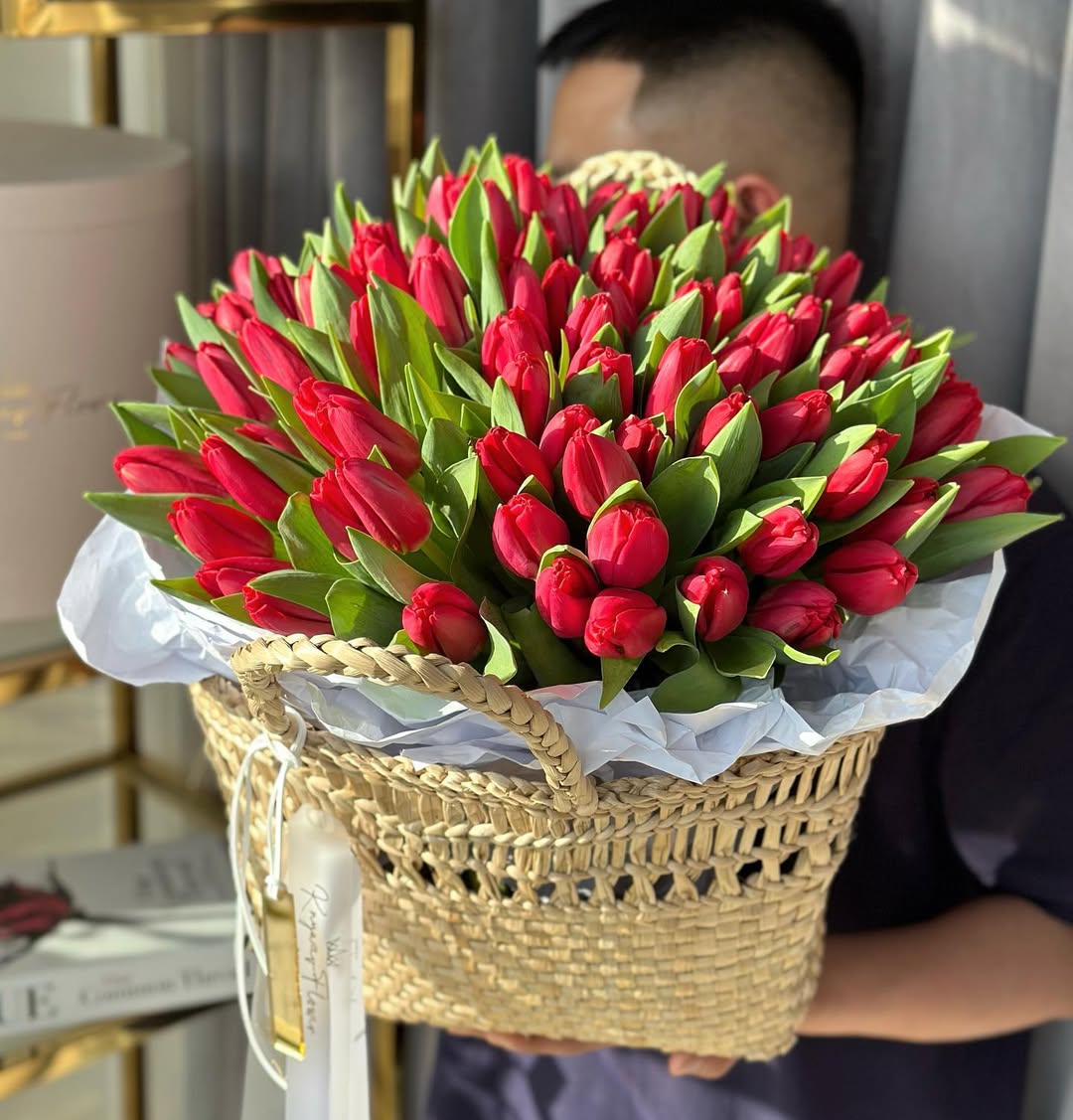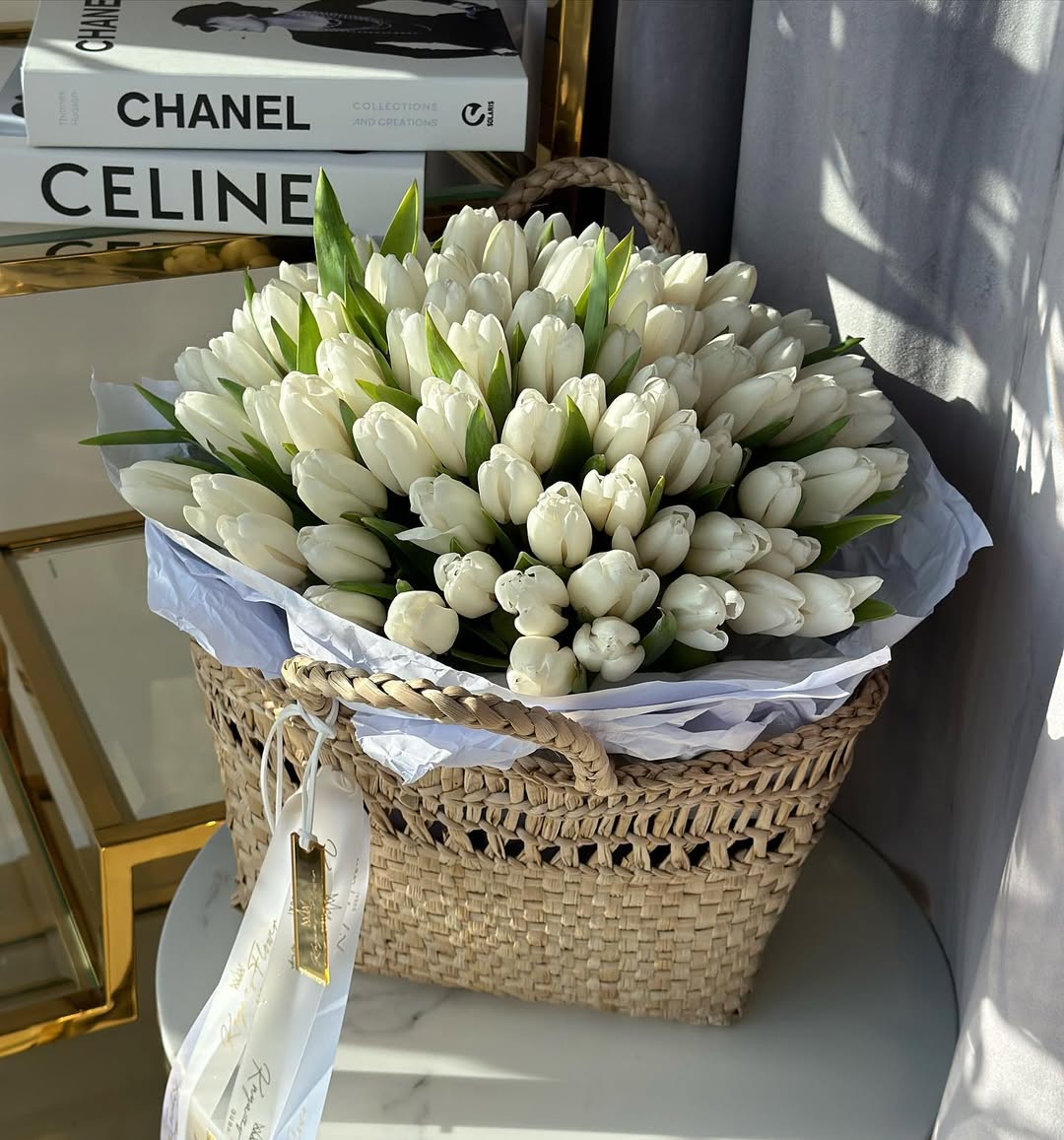 Crisp white tulips gathered into a full, structured basket create a look that feels fresh,...