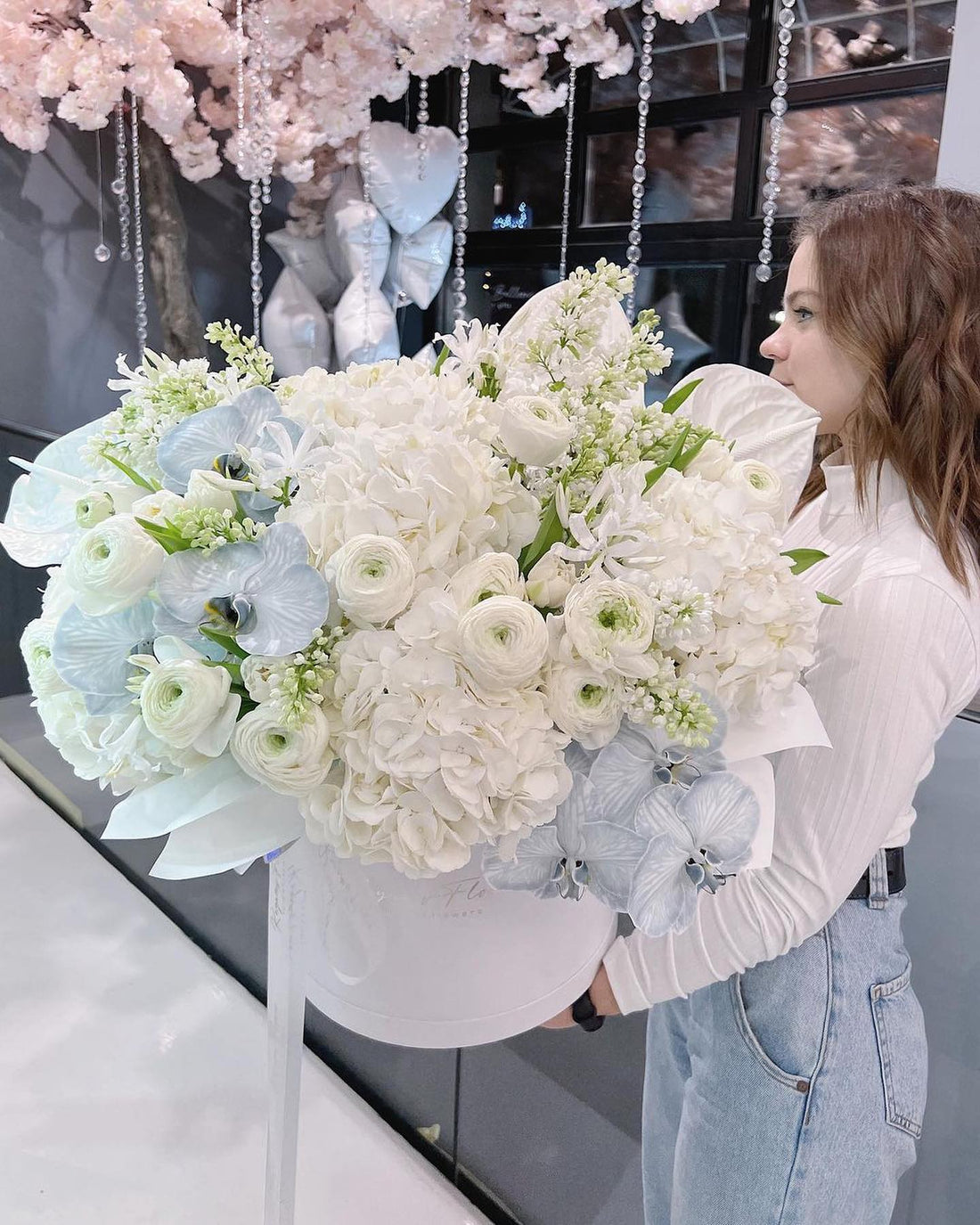 An ultra-voluminous arrangement of pristine white orchids, sculpted into a flawless dome. Minimal, architectural, and...