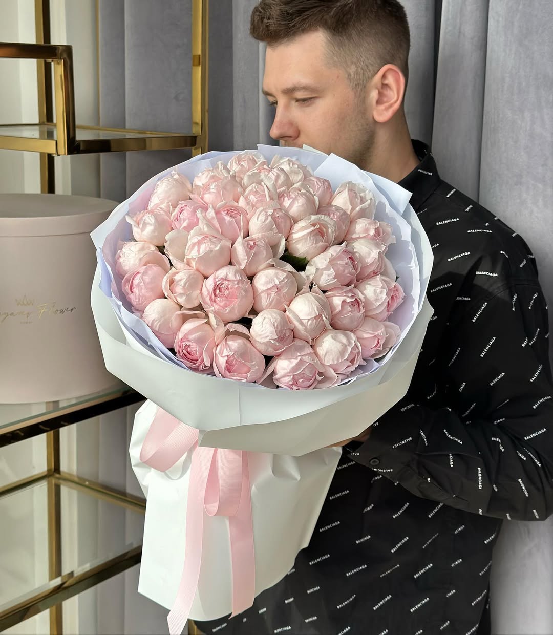 Tightly gathered blush peonies form a full, rounded silhouette with a plush, sculptural feel. The...