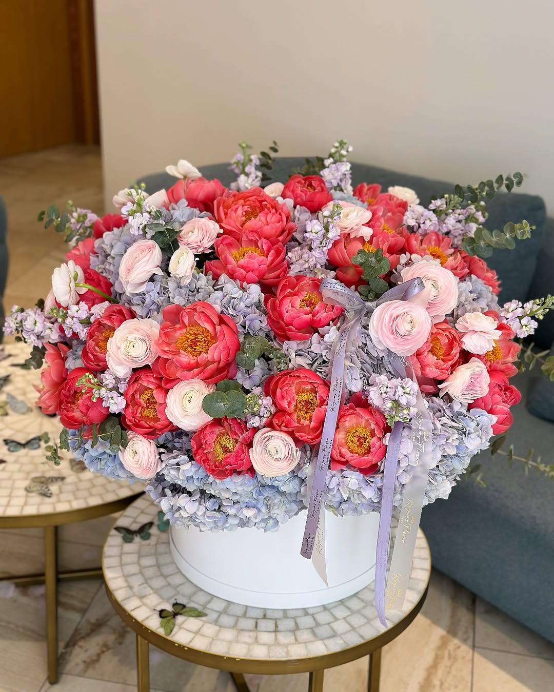 A bold, expressive composition built on contrast and rhythm. Lush coral peonies anchor the arrangement,...