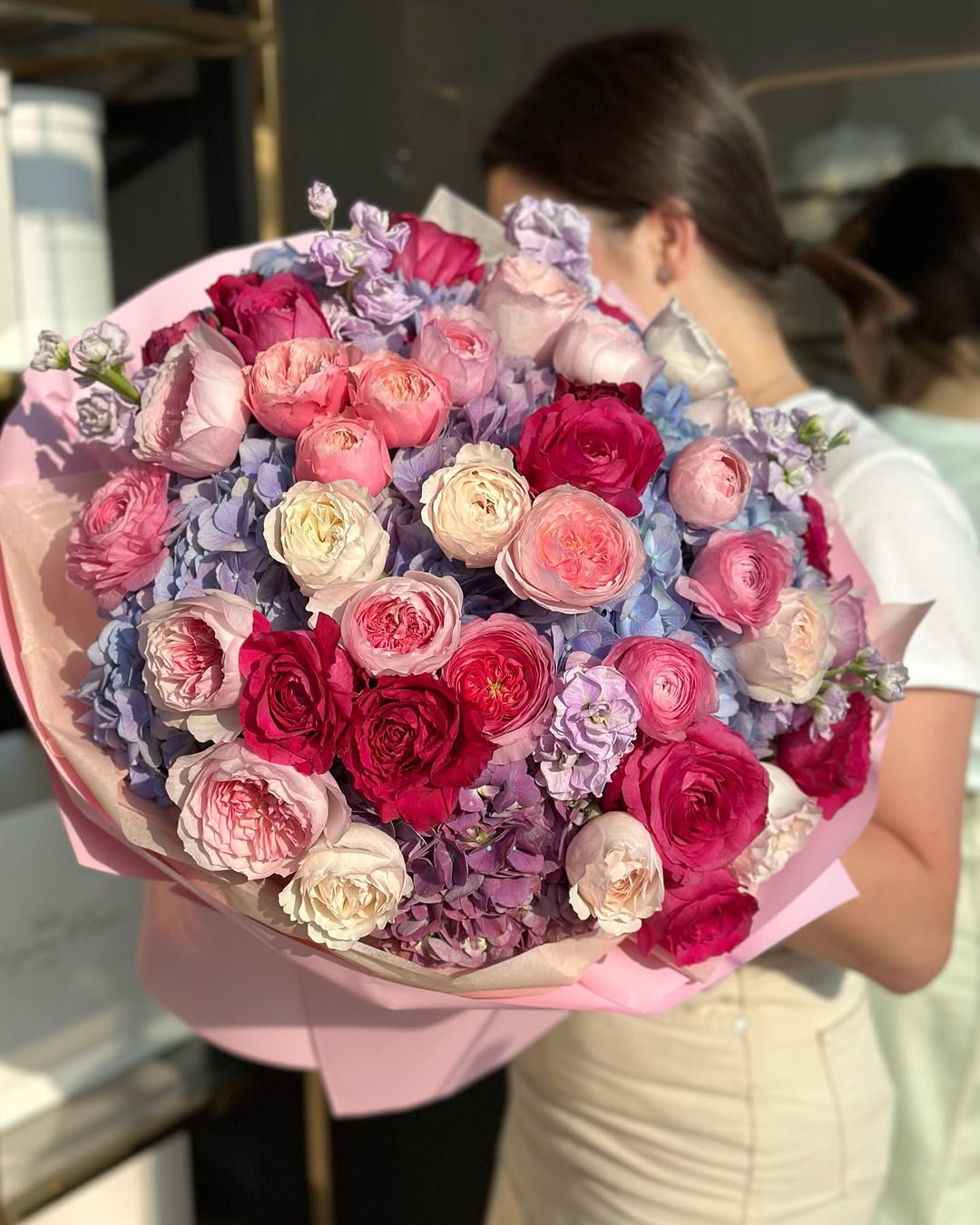 A rich, layered bouquet blending deep pink and soft blush garden roses with airy hydrangea...