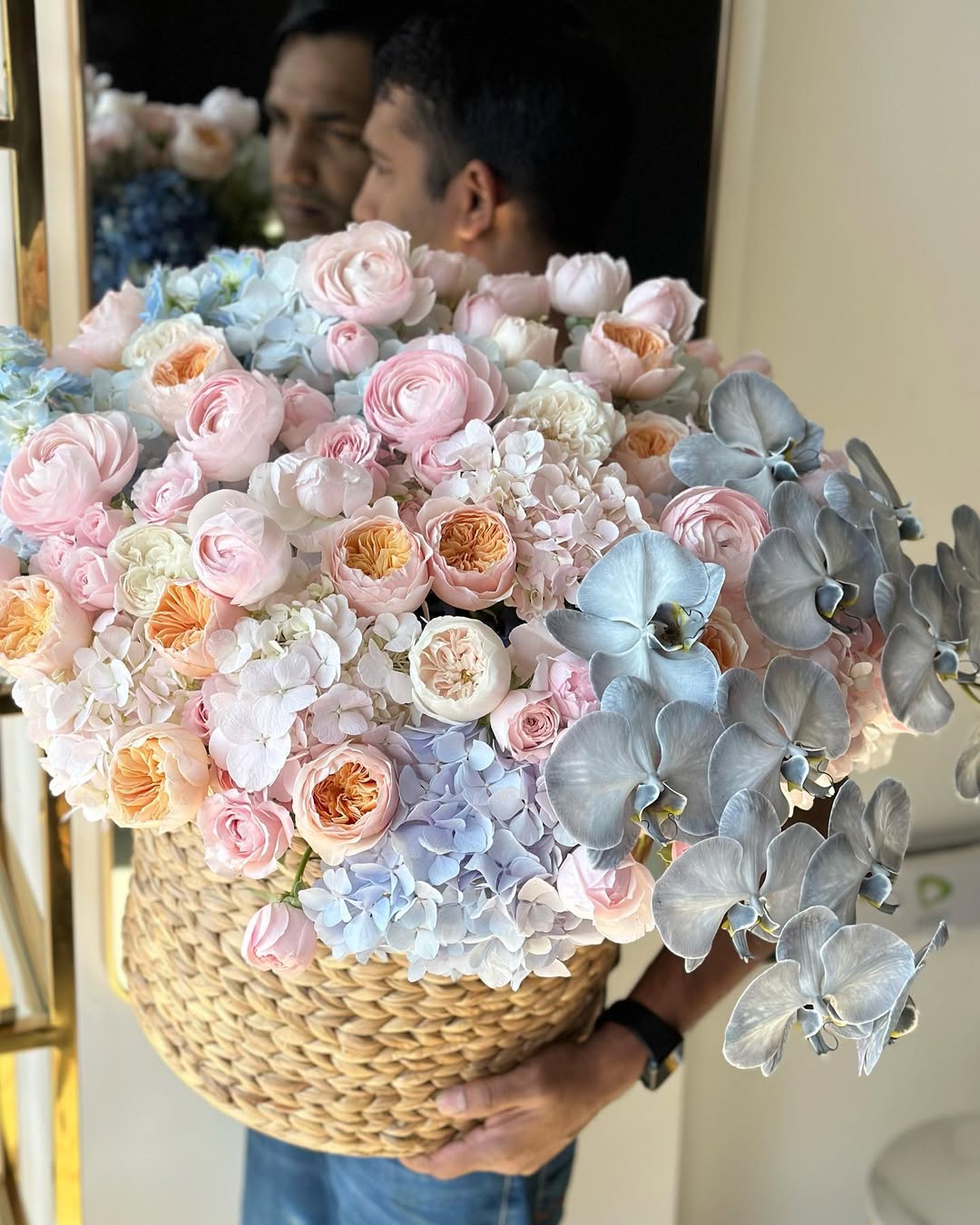 An oversized couture bouquet in layered pastel tones, combining airy volume with complex floral texture....