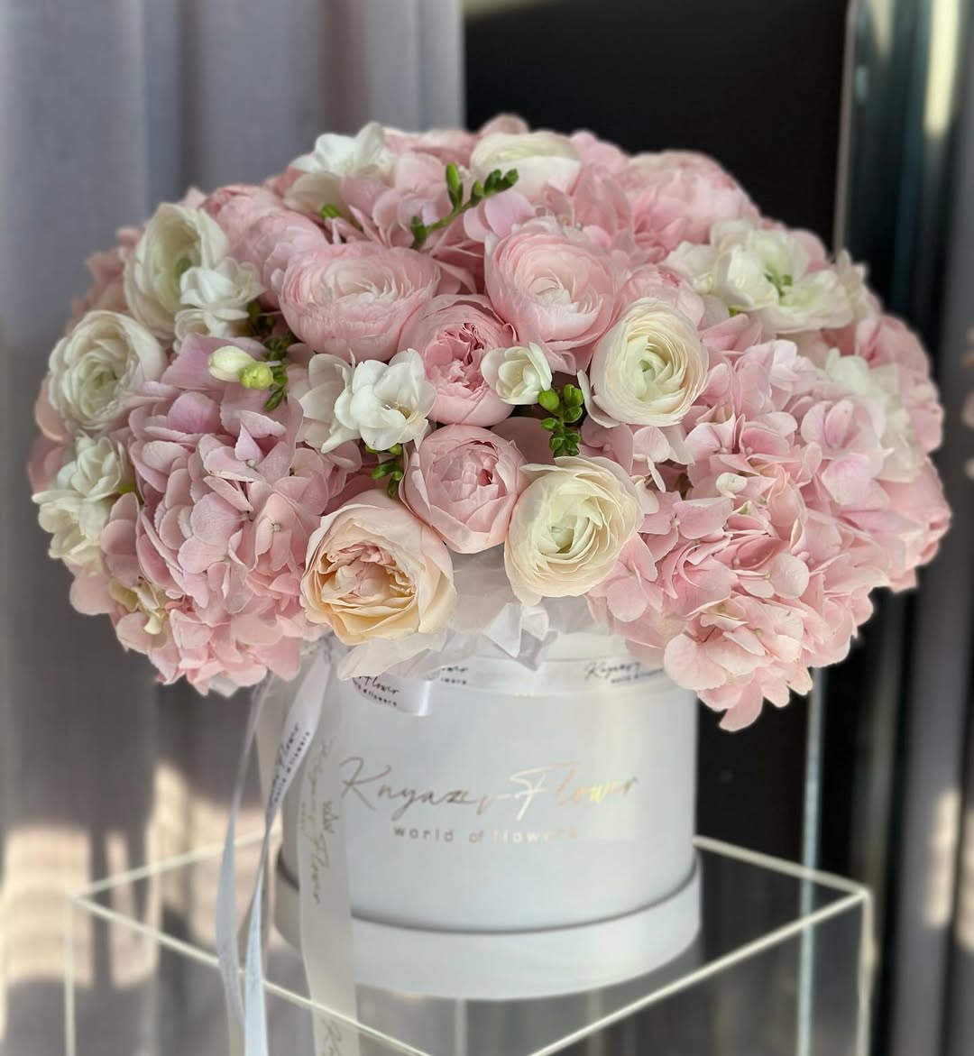 A refined box arrangement built around soft pink hydrangea and layered ranunculus, balanced with creamy...