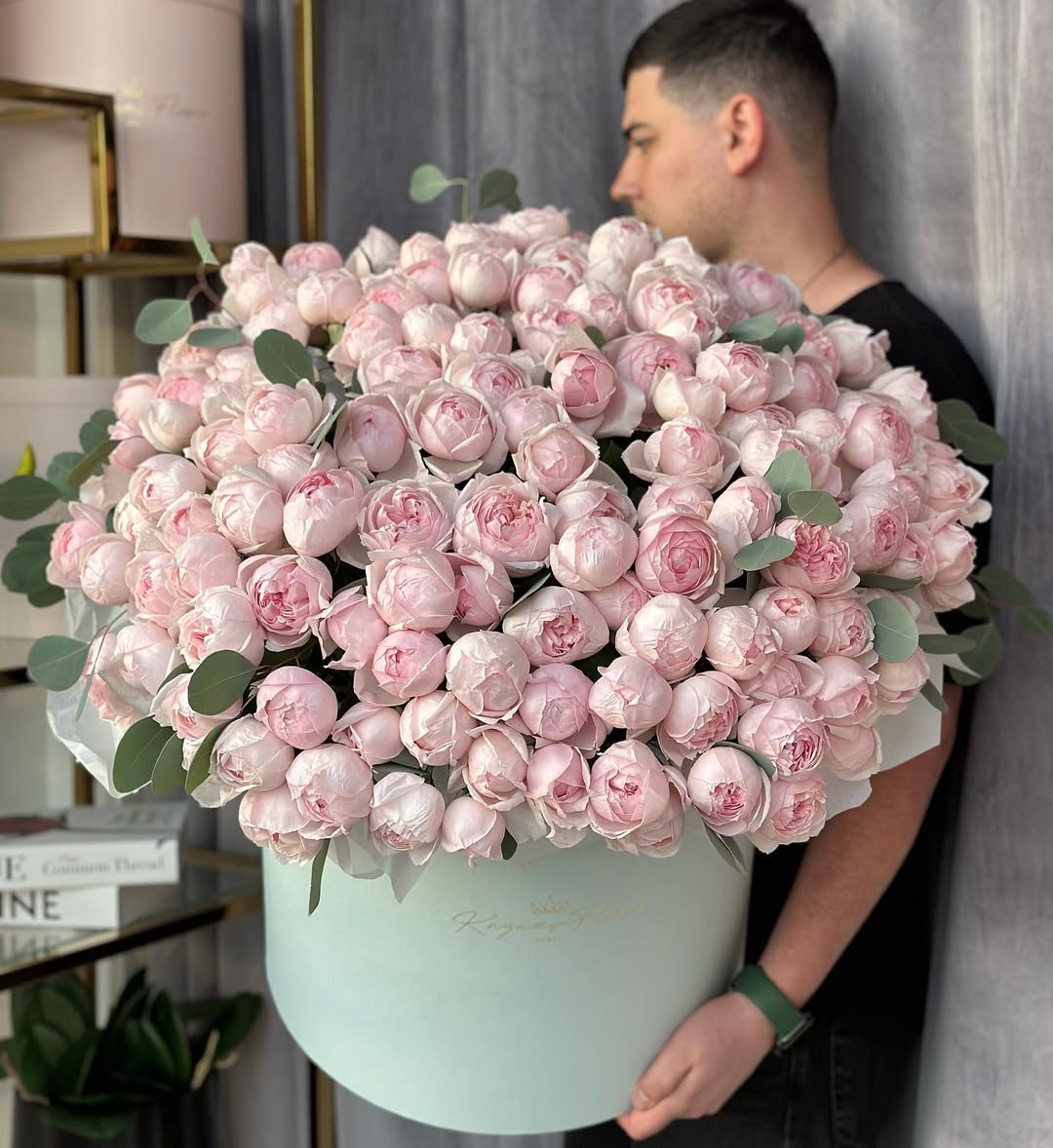 Hundreds of blush-toned rose buds form a dense, rounded composition with a plush, couture feel....