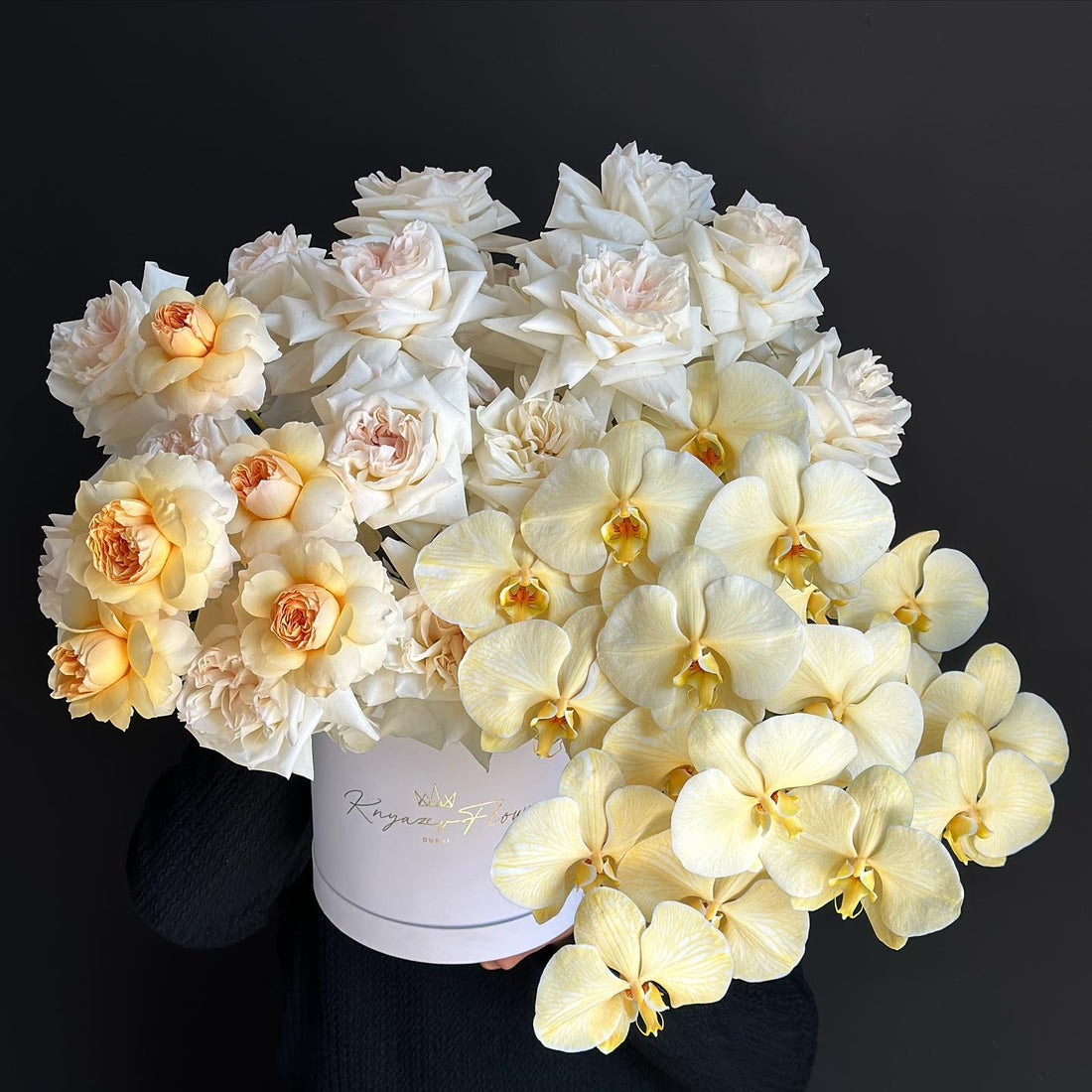Warm ivory roses paired with cascading pale-yellow orchids create a sculptural, gallery-level composition with quiet...