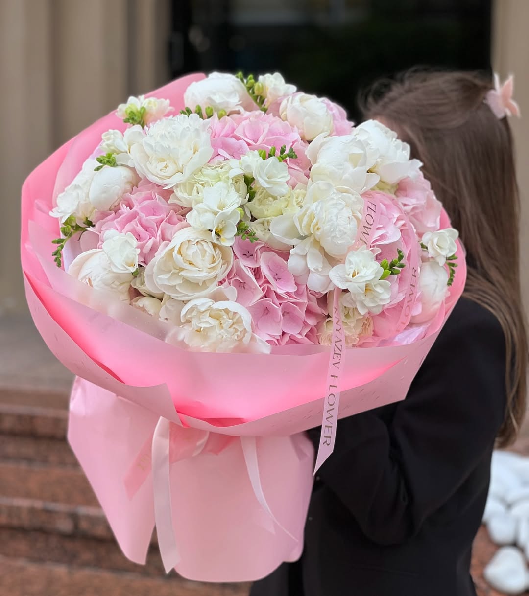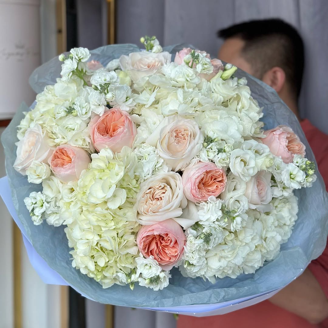 An airy, cloud-like arrangement in soft ivory and blush tones. Creamy hydrangea creates a full,...