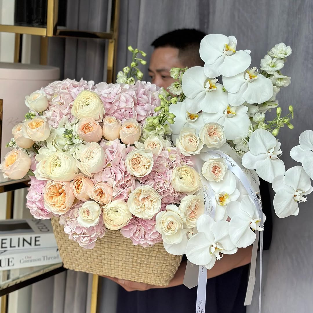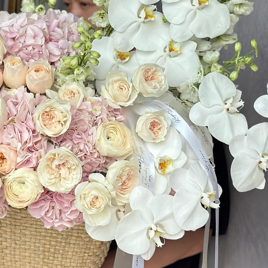 Soft blush and cream tones settle into a lush, sculptural composition with an airy yet composed presence. Rounded textures meet cascading white accents, creating a refined contrast that feels intentional and serene. A polished choice for luxury floral baskets, elevated gifting, or elegant delivery where harmony and detail take center stage.