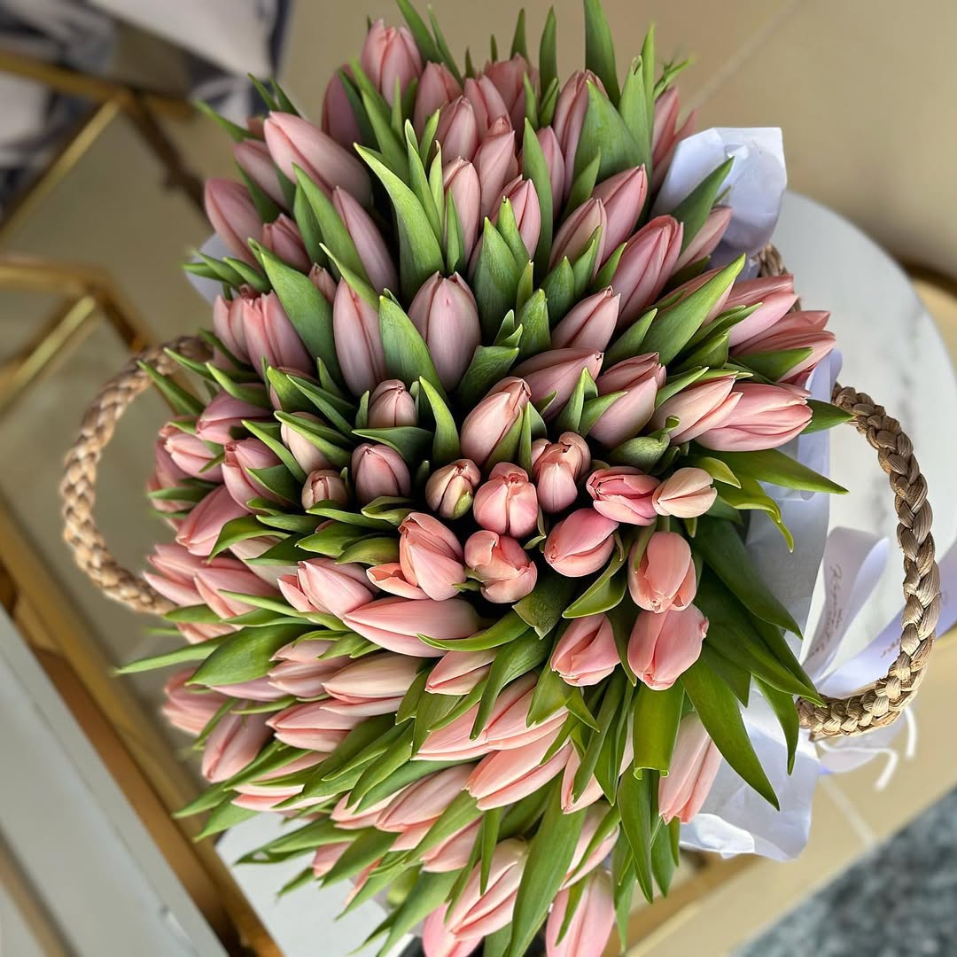 Pale blush tulips gathered tightly into a low, generous basket create a fresh, understated look with a natural rhythm. Closed buds and crisp green leaves bring a sense of movement and quiet anticipation. A refined choice for seasonal gifting, modern interiors, or elegant floral delivery where softness feels intentional.