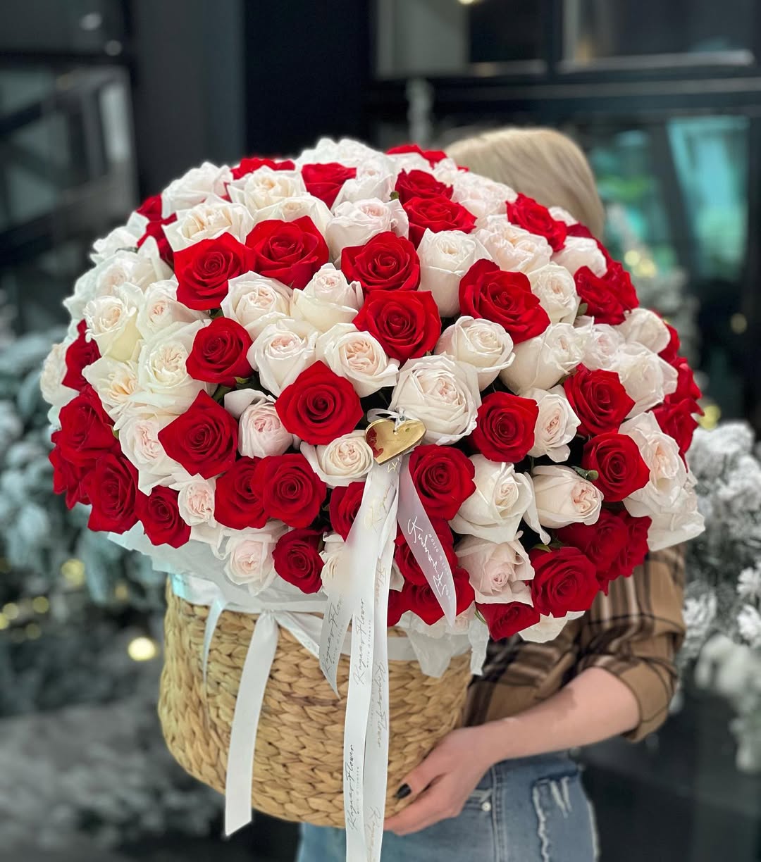 A striking basket arrangement featuring a precise balance of rich red and soft ivory roses. Bold yet timeless, this composition delivers a strong romantic statement with a clean, elegant finish.