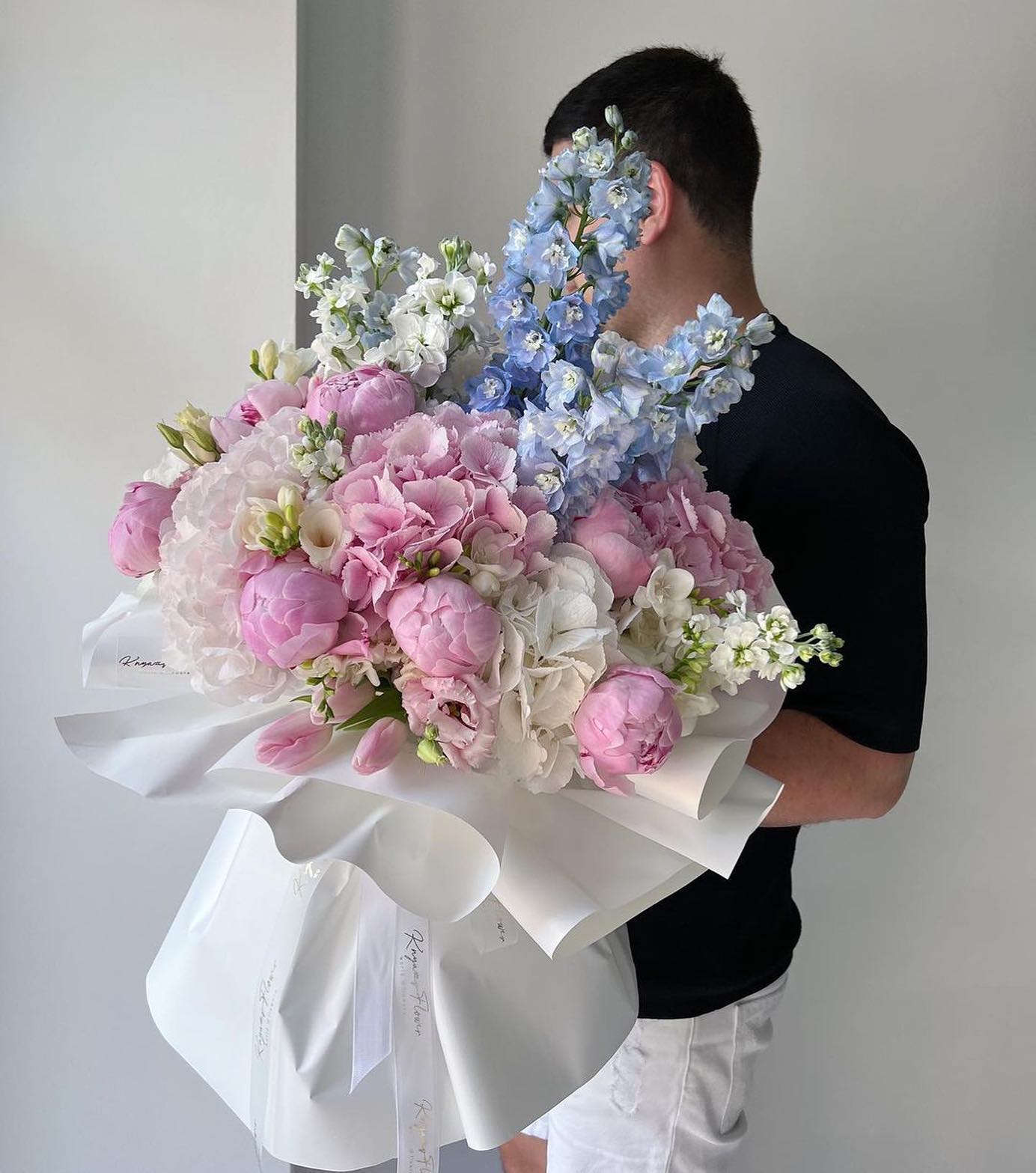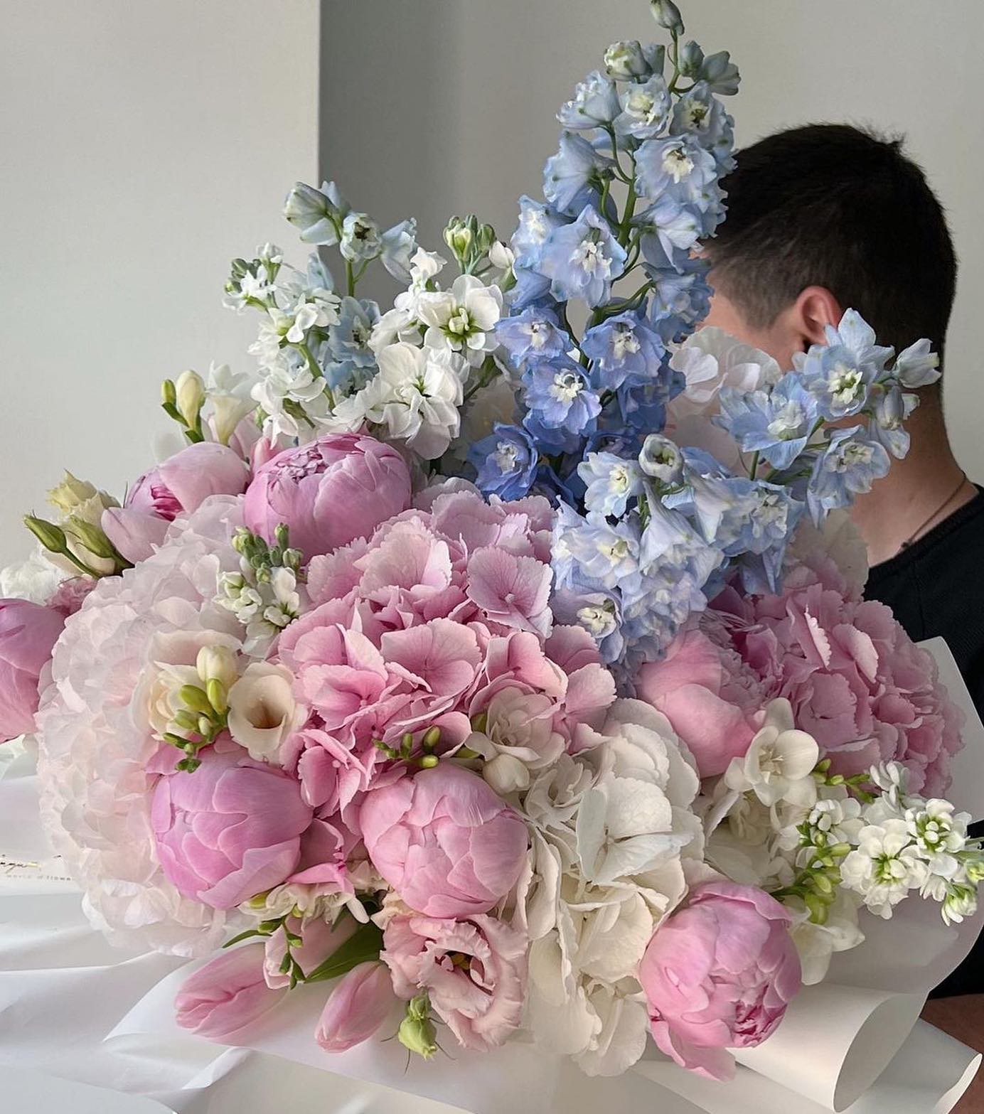 Soft pastel tones come together in an airy, sculptural composition with a light, romantic character. Blush pinks, creamy whites, and gentle sky-blue accents create a calm yet expressive presence, ideal for refined gifting, elegant celebrations, or luxury bloom delivery. The layered textures and flowing shape give this piece a couture feel that fits effortlessly into premium interiors and special moments.