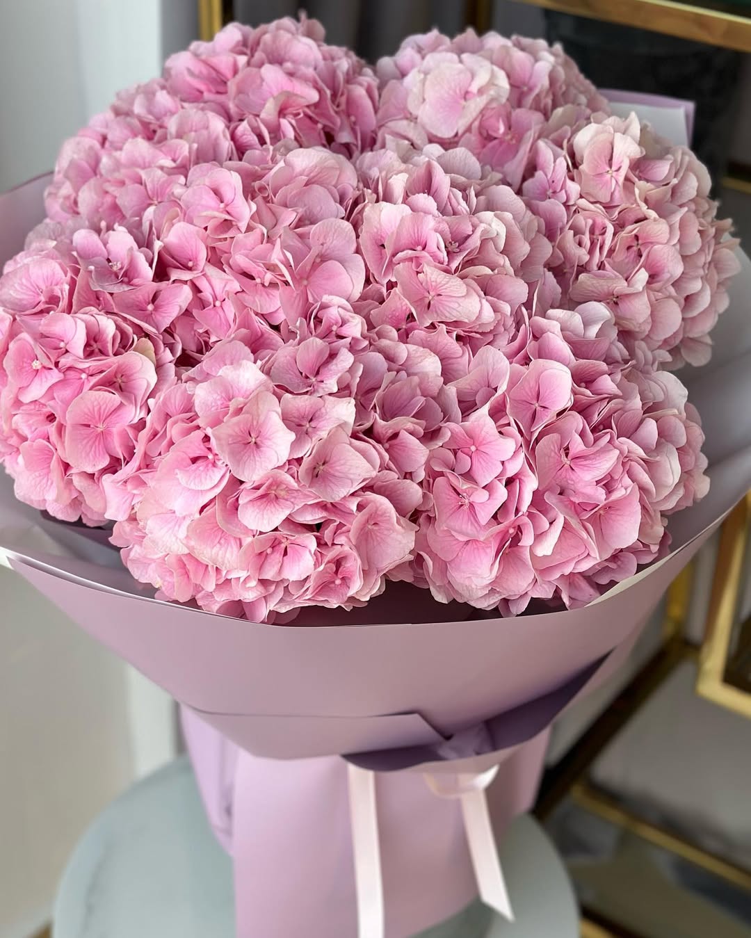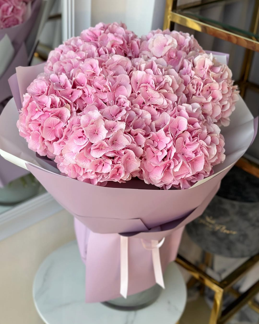 A voluminous bouquet composed entirely of lush pink hydrangeas, shaped into a soft, rounded silhouette. Delicate pastel tones and cloud-like texture create a calm, refined presence — elegant, modern, and effortlessly luxurious.